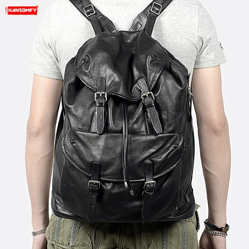 BEST New casual top layer cowhide men's backpack large capacity black soft genuine leather shoulder bag